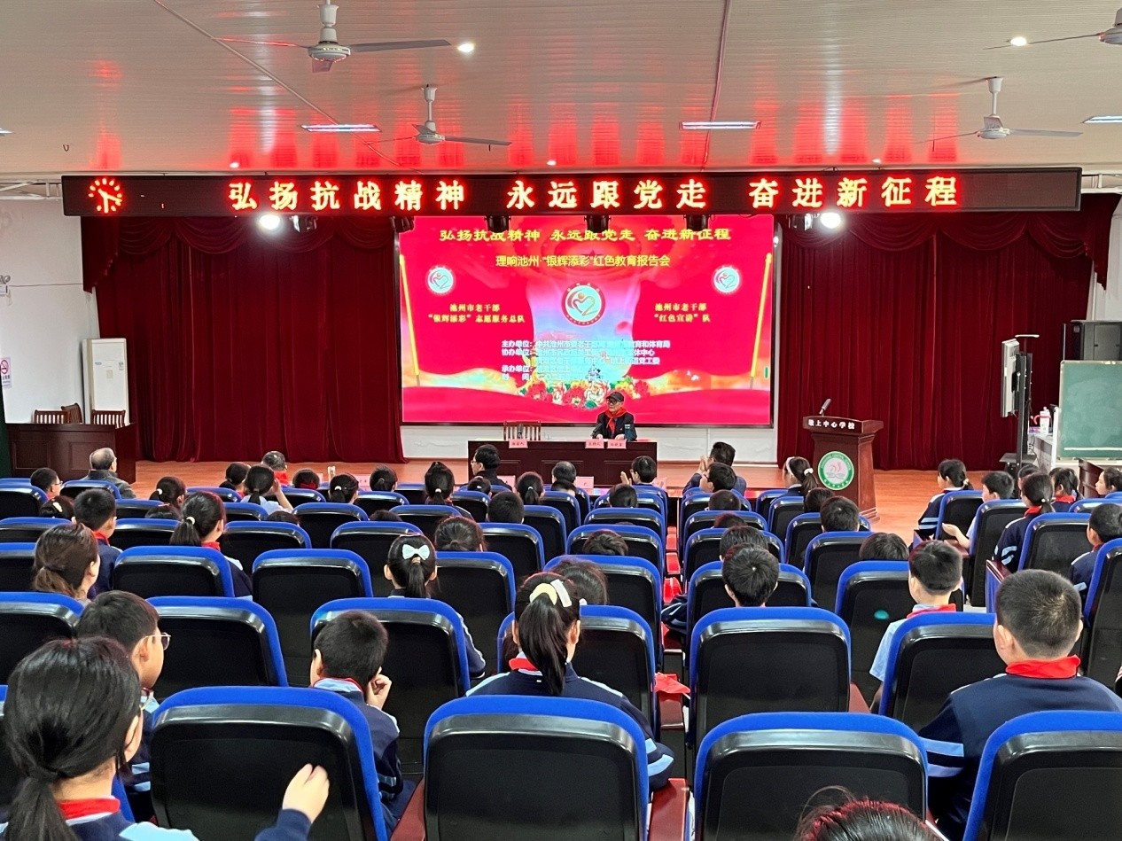 报告会主题是弘扬抗战精神,对中小学生加强爱党爱国教育、励志教育。池州军休中心退役干部、原贵池区人武部部长郑长海作弘扬抗战精神、爱党爱国报告。池州军休中心退役干部、一级残疾革命军人、二等功臣、全国模范退役军人江建军作励志教育报告。两位关工老人回忆介绍了抗日战争时期,我国军民不畏强暴、血战到底的英雄气概和坚忍不拔的必胜信念,终于取得了抗日战争的伟大胜利。二老在