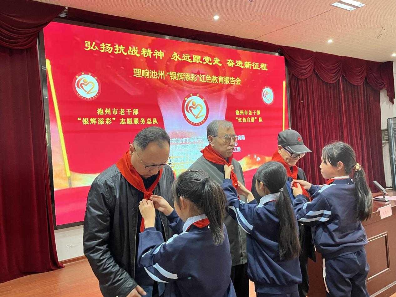 报告会由池州市民政局关工委常务副主任、市民政局德教报告团团长、池州市银辉添彩红色宣讲队队长孙晓勇主持。贵池区墩上中心学校副校长施天鸿致欢迎词。市委老干部局、市民政局关工委、市教育体育局关工委、市老干部活动中心、市军休中心、贵池区老干部服务中心、墩上街道党工委、墩上中心学校等部门负责同志出席报告会,贵池区墩上中心学校五年级300名学生参会听报告。