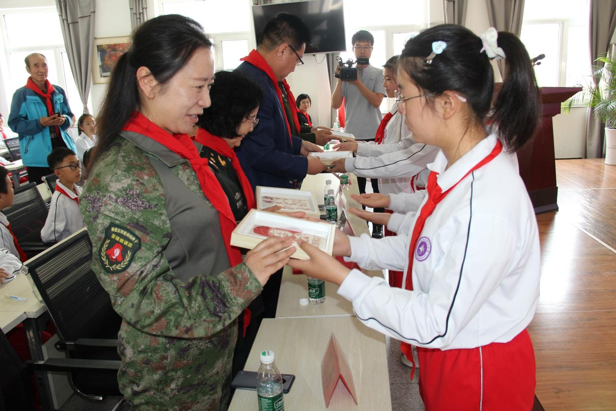 随后,群力小学、东风小学校领导为孙桂琴颁发名誉校长聘书,表达对她一生传承雷锋精神的诚挚敬意。“雷锋朗诵团”卫丹团长、石海滨政委授予两所小学“雷锋朗诵团”称号牌匾及团旗,两所学校庄重地接过牌匾和团旗,意味着雷锋精神将进一步在校园中发扬与传承。于洋老师在致词中,向广大师生们发出“携手共进,以雷锋为榜样,让雷锋精神在新时代焕发出更加耀眼的光芒”的号召。学生代表向特邀嘉宾赠送了精心制作的雷锋形象非遗竹编画,竹编画工艺精美,饱含着学生们对嘉宾的尊敬和对雷锋精神的热爱。