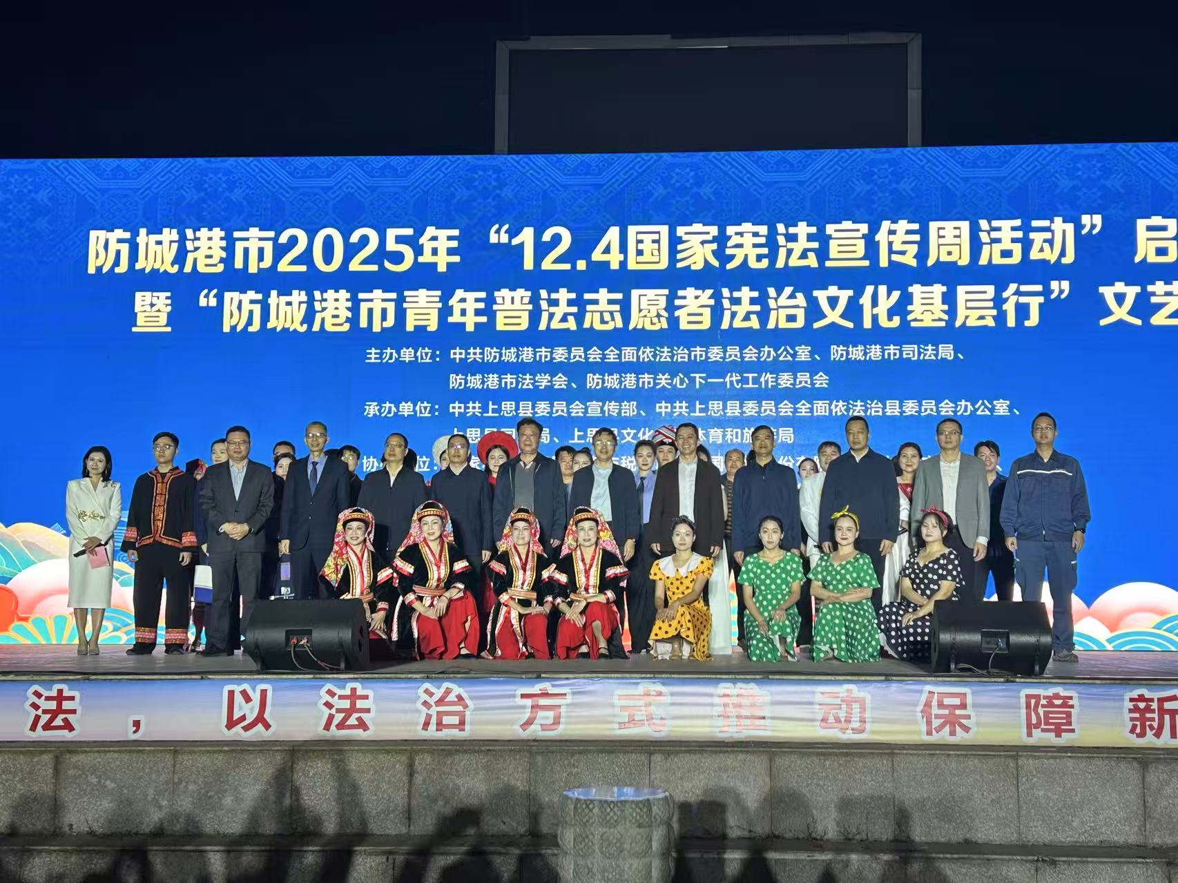 当天晚上,在上思县明江公园广场,市关工委联合相关单位共同主办防城港市2025年“12·4国家宪法宣传周活动”启动仪式暨“防城港市青年普法志愿者基层行”文艺汇演活动,近千名群众到场观看。活动现场,市关工委执行主任倪耀中在晚会上宣读《防城港市乡村法治宣传教育倡议书》,向广大群众发出学法守法的倡议;“五老”志愿者带来朗诵节目《法治之光》,以真挚的情感与有力的表达礼赞2025全面依法治国工作会议精神;合唱节目《宪法之歌》则以激昂的旋律,展现了全社会共建法治社会的坚定决心。