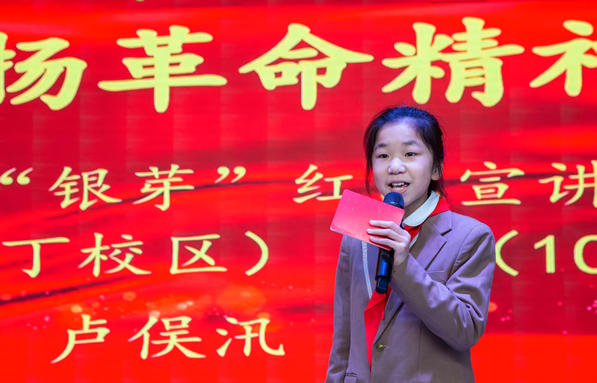 童声宣讲,深植情怀。 宣讲环节,“银芽”红色小宣讲员卢俣汛以“追忆长征足迹 弘扬革命精神”为主题,用真挚的童声和生动的图文,深情讲述了红军长征途中的感人故事。从一张彰显严明纪律的红军借据,到突破第二道封锁线的无畏勇气,再到映照军民鱼水情深的半条被子,一个个鲜活的故事、一段段峥嵘的岁月,让在场师生深受触动。为增强互动性,现场设置了知识抢答环节,同学们踊跃举手、积极应答,在激烈的角逐中加深了对长征历史的理解,革命信仰与爱国情怀在心中悄然扎根。