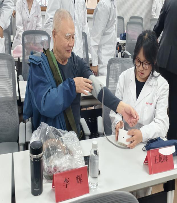挂牌仪式结束后,军休干部代表、原牡丹江军分区东宁人武部部长魏中和,结合自身军旅生涯与国防建设实践,为青年学子开展国防教育宣讲。通过知识问答、互动交流等形式,推动红色基因入脑入心、国防理念根植于心,进一步厚植青年家国情怀,强化国防意识与使命担当。医学院青年学子还为军休干部开展健康基础检查,以实际行动彰显对革命前辈的尊崇关爱,展现新时代青年的青春担当。