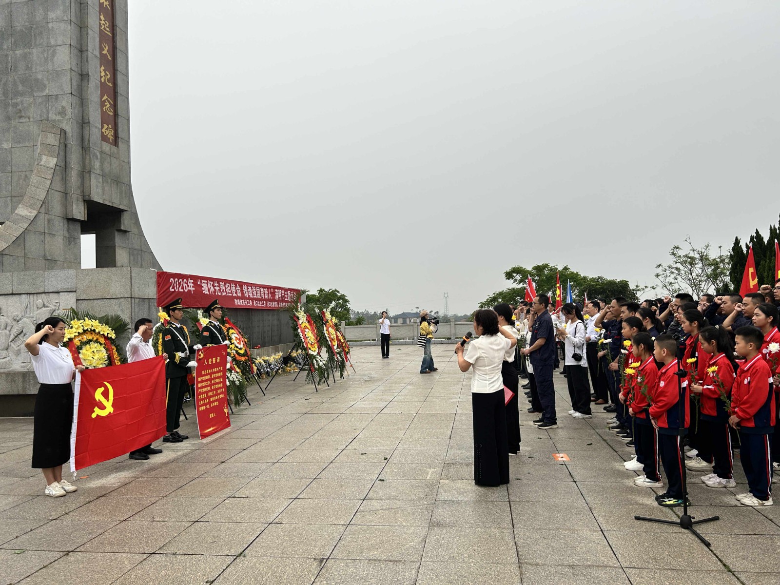 庄严肃穆的纪念碑前,活动在雄壮的国歌声中拉开帷幕。随着《献花曲》悠扬奏响,全体人员整齐列队,向革命先烈默哀致敬,并行三鞠躬礼,寄托对英烈的无限追思与崇高敬意。活动现场,学生代表饱含深情地朗诵红色诗篇,字句铿锵有力,既追忆往昔峥嵘岁月,也礼赞今日盛世辉煌,尽显新时代青少年的赤诚初心。一曲《如愿》缓缓响起,悠扬纯净的童声温暖动人,满含对先辈的告慰与感念,也寄托着对美好未来的无限期许,让在场众人泪湿双目、深受触动。