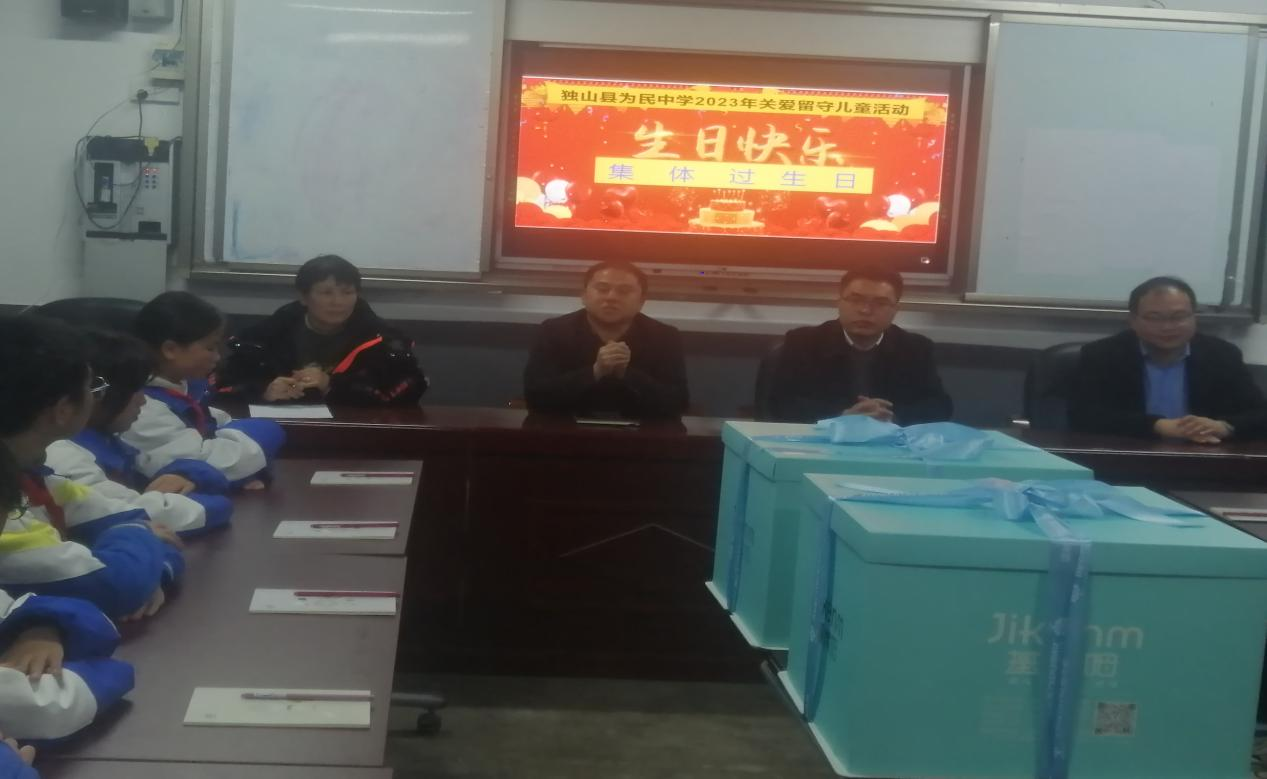 2023年12月29日,独山县为民中学关工委为40位留守儿童集体过生日,学校党总支书记、关工委主任龙政元、关工委副主任刘兰刚、田茂民、秘书长陆芬参加本次活动。