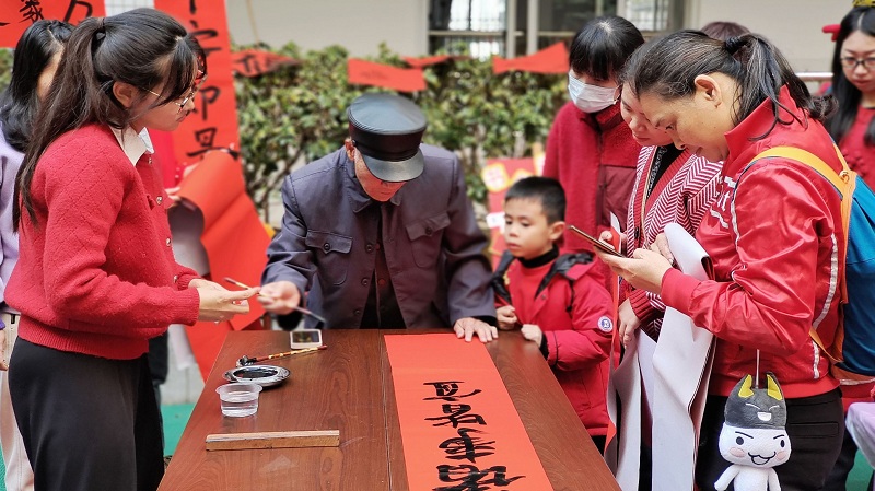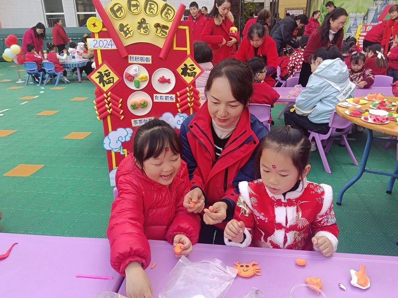在这穿红衣、赶庙会,喜气洋洋,年味儿浓厚、欢乐祥和的氛围里家长们带着自己的孩子穿梭在庙会活动中。庙会活动共设置了多个游艺场地,各种活动精彩汇集,有团团圆圆年夜饭、书“福”迎新年、喜庆灯笼、剪窗花捏泥人等多种活动形式。音乐起吉时到,家长和孩子们欢欢喜喜庆新年,妙趣横生逛庙会!