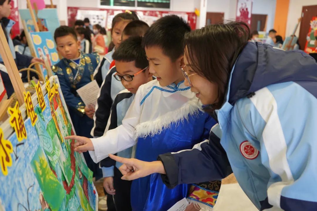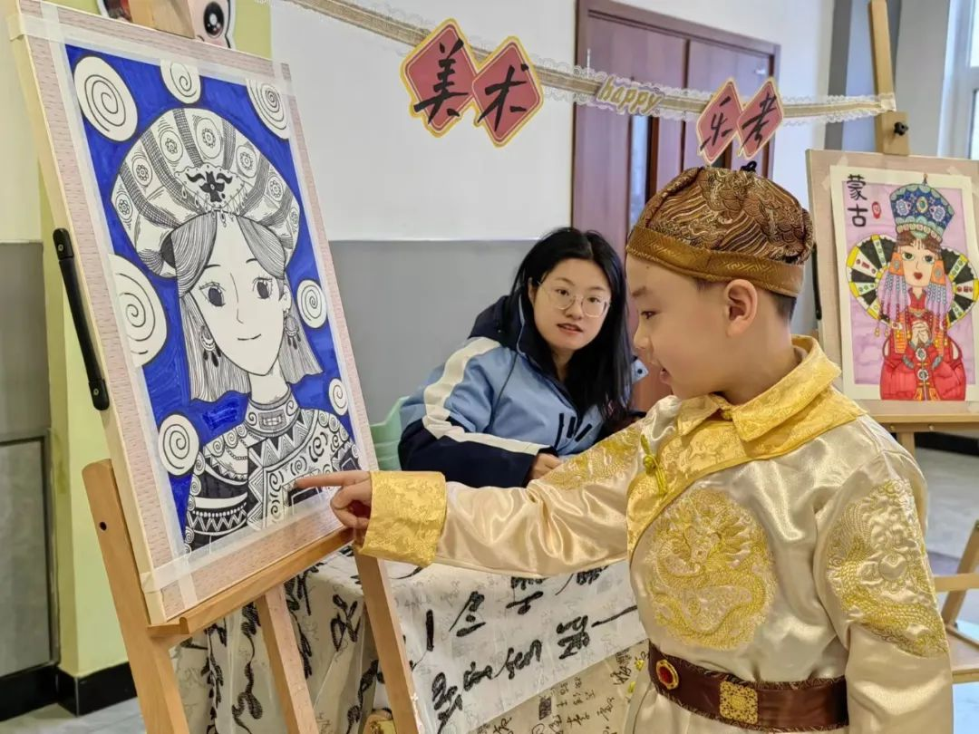 色彩、线条、美感,是那么令人着迷。灵动的笔触留下奇特的印迹,孩子们在作品中寻找所学内容,感受民族文化的神秘魅力。