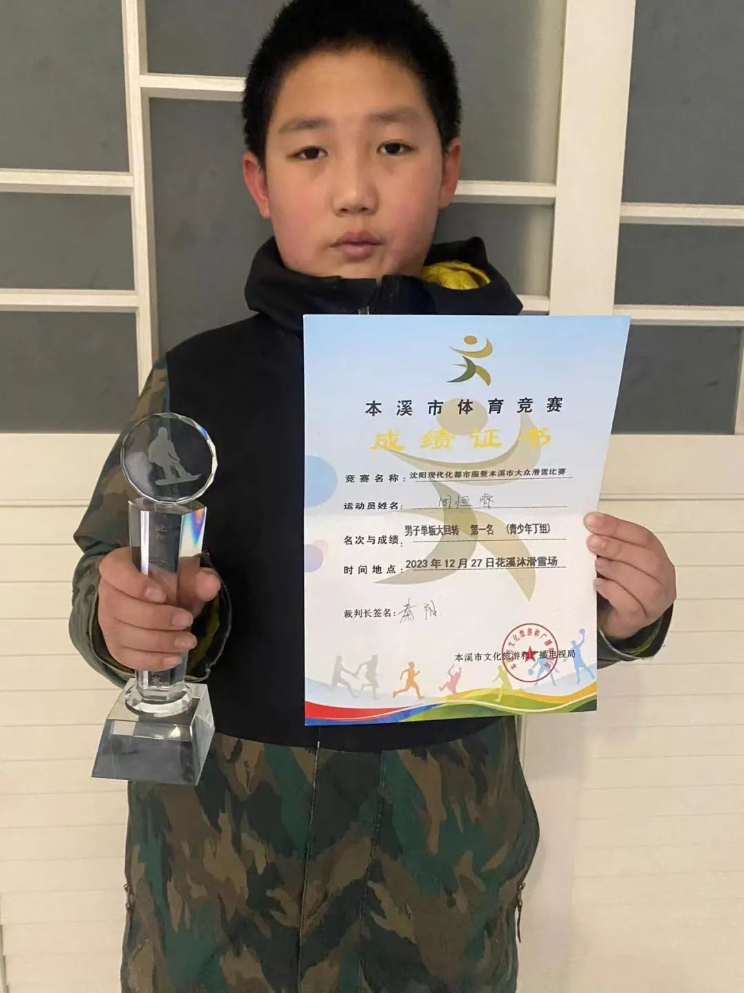 12月27日, 明山区实验小学关工委组织学生参加沈阳现代化都市圈暨本溪市大众滑雪比赛,经过激烈角逐,明山区实验小学五年三班周恒睿同学在10-11岁青少年丁组男子单板大回转比赛中,以29.68秒取得该组别第一名的好成绩赢得比赛。