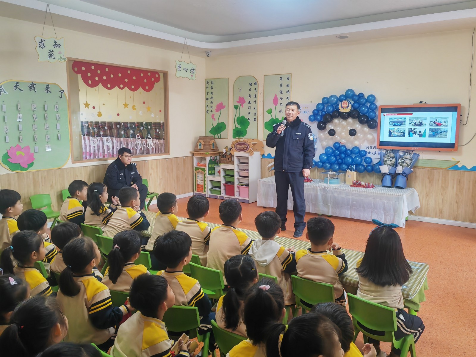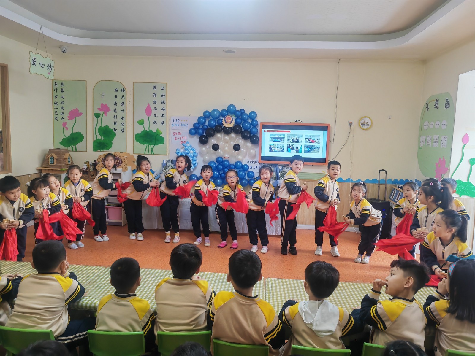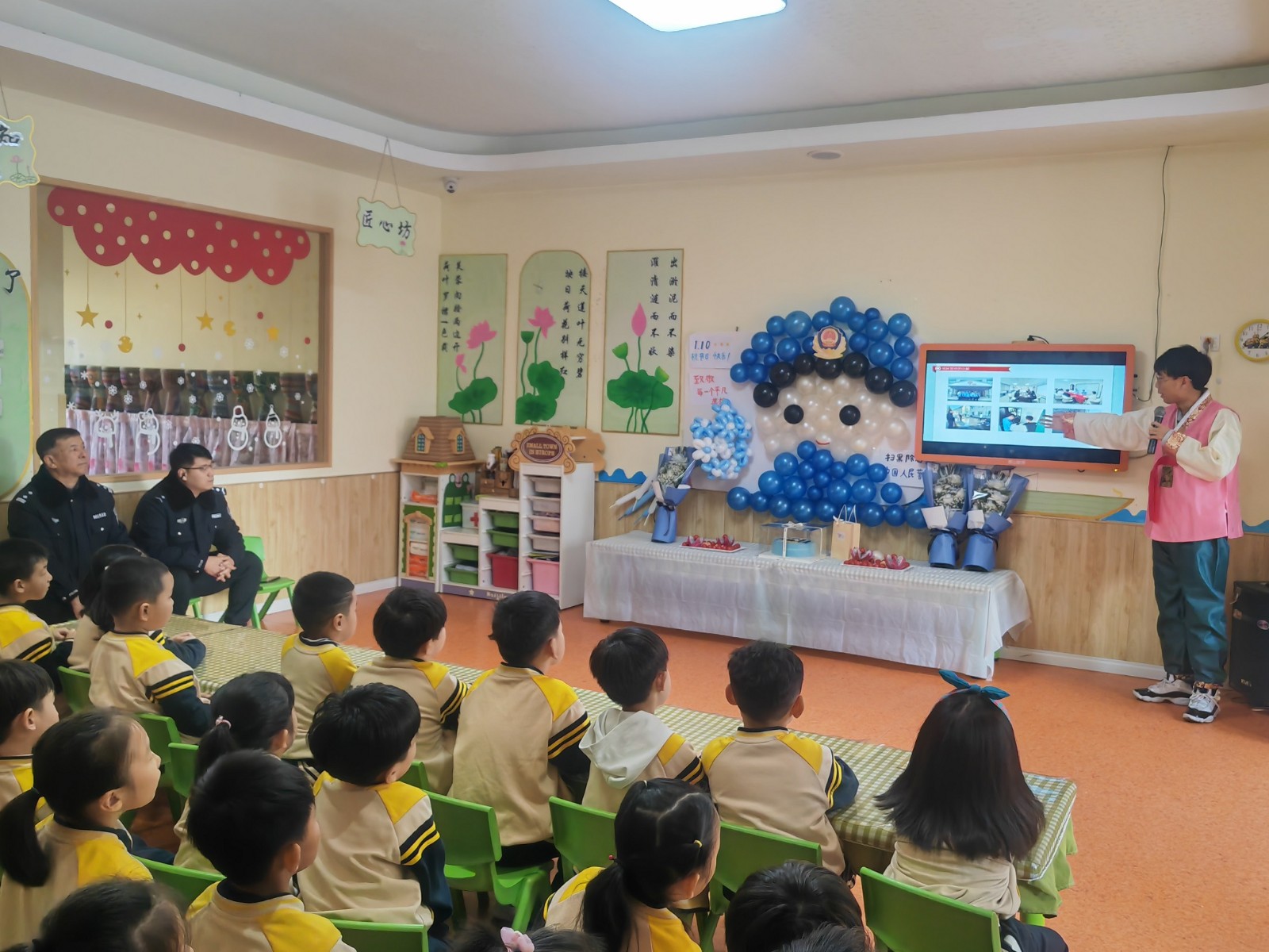 孩子们还为警察叔叔表演了精心排练的文艺节目,并送上鲜花、蛋糕表达节日的祝福和敬意,在孩子们的欢呼雀跃中实现了“大手”牵“小手”、“警心”连“童心”。