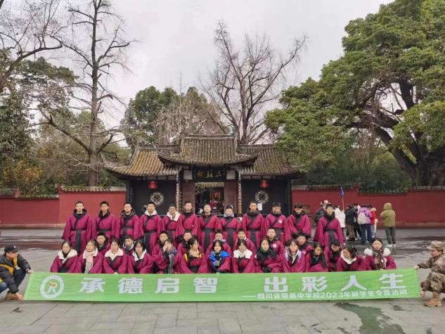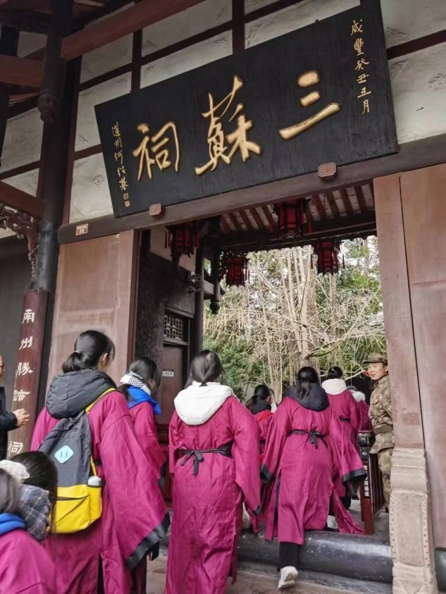 1月24日上午,自贡市荣县中学关工委副主任高奇星带领本校冬令营一百名学生来到眉山市著名文化景区三苏祠。三苏祠是北宋著名的苏洵、苏轼、苏辙三人的故居。在导游的引领下,大家一边全神贯注的聆听解说员的讲解,一边仔细观看祠内的文物。
