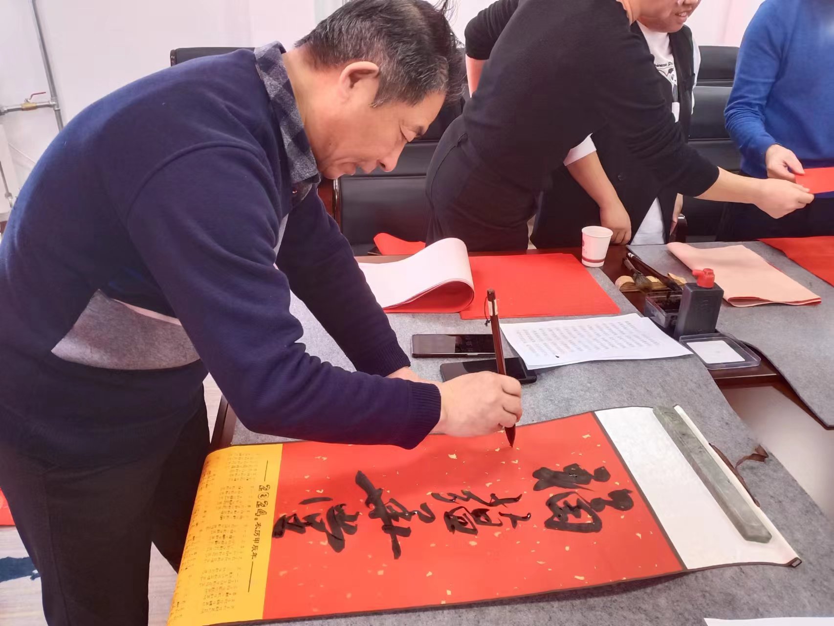 岁月添新,春满山河。王彪、李增祥、沈家荣、王斌、张守军、李向海等6名“五老”书法家应邀参加了活动。活动现场,书法家们伏案挥毫,笔走龙蛇,一幅幅充满祝福和对美好生活向往的祝福词句跃然大红对联与福字纸上用象征喜气吉祥的红纸,挥毫泼墨,开始齐刷刷地书写春联,写的是汉字,报的是节讯,暖的是人心。一副副飘散着清新墨香、寓意吉祥的春联,一张张喜气洋洋的“福”字跃然纸上,表达人们祈求来年福运降临和阖家幸福的美好愿望,让整个现场充满了文化气息。“天增岁月人增寿、福满乾坤福满楼”、“迎喜迎春迎富贵、接财接福接平安”……真诚的祝福溢于字里行间。一张张行云流水、苍劲有力的大红“福”字、一副副喜庆吉祥的春联,洋溢着浓浓的喜庆氛围,传递着温馨的和谐的场面,不仅增添了浓郁的年味,更承载着驿站人对新年的诚挚祝福,赢得了现场参加活动职工、“五老”及群众们的阵阵喝彩。