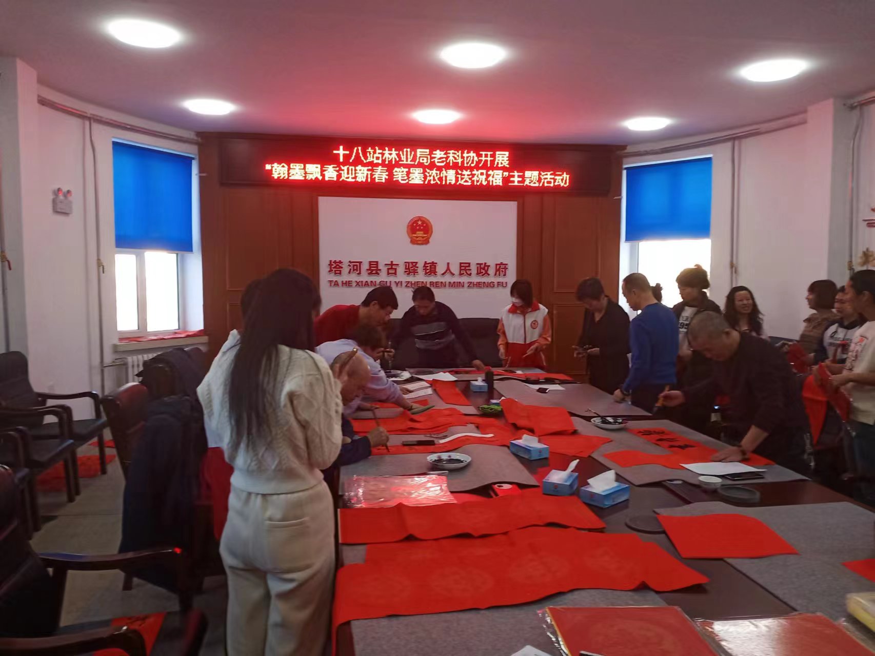 为弘扬春节传统文化,营造喜庆祥和的新春佳节氛围,1月30日在春节来临之际,十八站林业局关工委与古驿镇等多家联合开展“翰墨飘香迎新春,笔墨浓情送祝福”主题活动,书法老师应邀来到现场开展写对联、迎新春、送祝福活动,在翰墨飘香中给古驿站“五老”及职工群众送去新春的祝福。