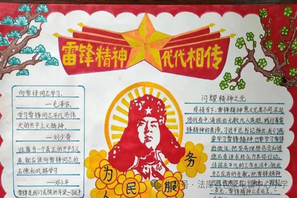 雷锋画报表敬意。队员们用自己灵巧的双手绘制了一张张精美的手抄报。报中有他们心目中的“活雷锋”,有他们做好事的身影,有他们响亮的口号,更有他们的拳拳爱心。