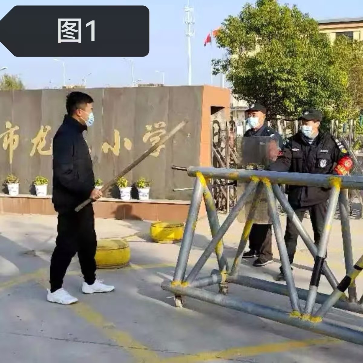 学校防暴小组成员履行自己的职责,使用各种防暴工具奋力抵抗暴力分子的行凶,与暴力分子周旋。