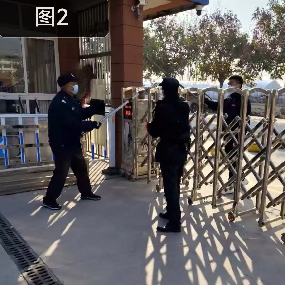 值班门卫立即追截阻拦“歹徒”,另一名保安趁机立即按下“一键报警”系统,同时大声呼喊。