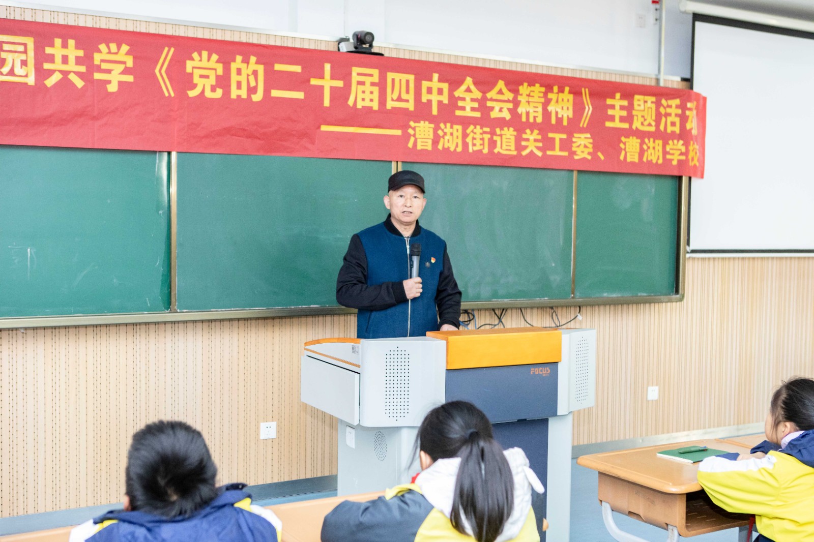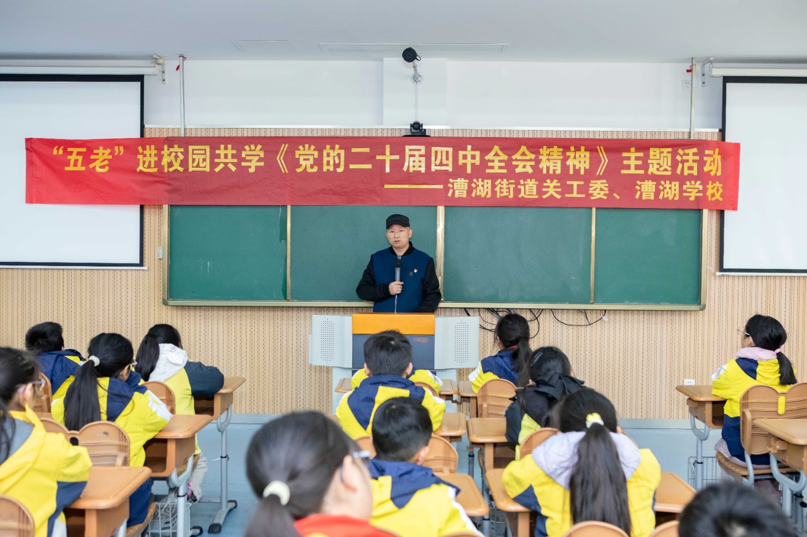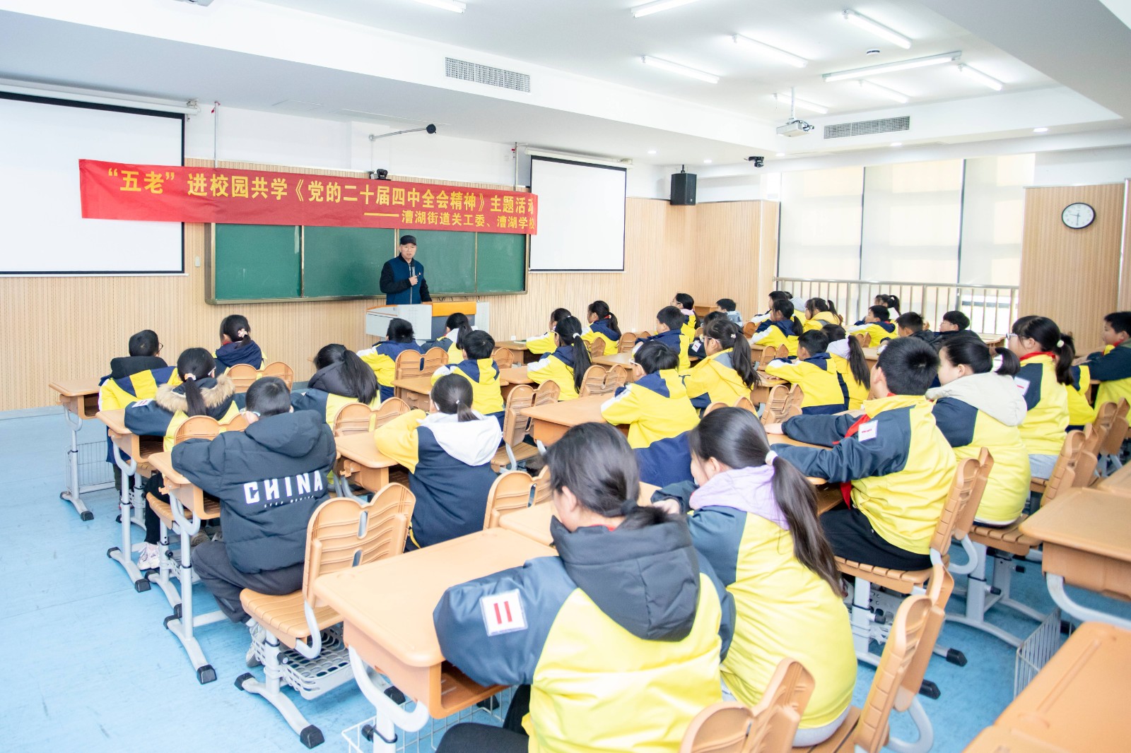 1月13日上午,苏州市相城区漕湖街道关工委联合漕湖学校组织“五老”进校园共学《党的二十届四中全会精神》的主题活动。街道“五老”钱三男同志带领学生在阶梯教室集中学习《党的二十届四中全会精神》,传承红色基因薪火,培育青少年爱国情怀,筑牢思想根基。