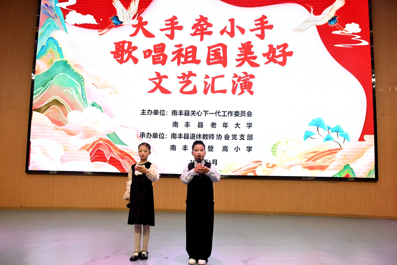 2026年1月16日下午,江西省抚州市南丰县关工委联合县老年大学、县退休教师协会党支部在县登高小学举办“大手牵小手 歌唱祖国美好”文艺演出活动。县关工委名誉副主任、县政府副县长王丽红,县政协二级巡视员、县关工委主任邓军,县老年大学校领导黄样生、饶明学、何良根,县退休教师协会党支部书记曾国才,县关工委班子成员和部分“五老”代表,县退教协分会会长,登高小学部分师生代表近200人,齐聚一堂,礼赞祖国美好。