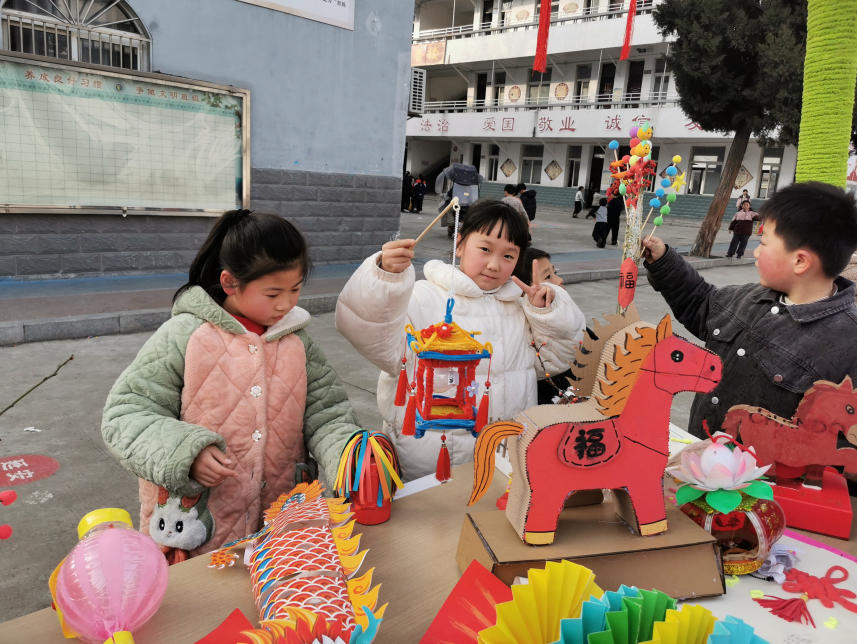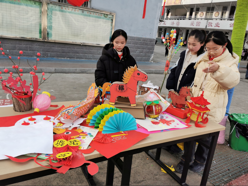校园内同步设置书画、剪纸展区,色彩斑斓的绘画、笔力稚嫩的书法、巧思满溢的手工作品,或绘新春盛景,或展传统文化,承载着孩子们的想象力与创造力,吸引师生驻足观赏、交流探讨。