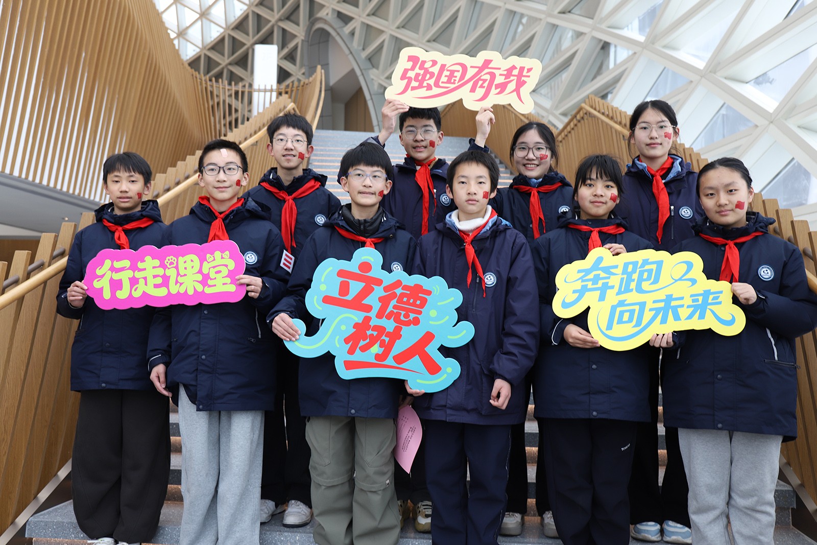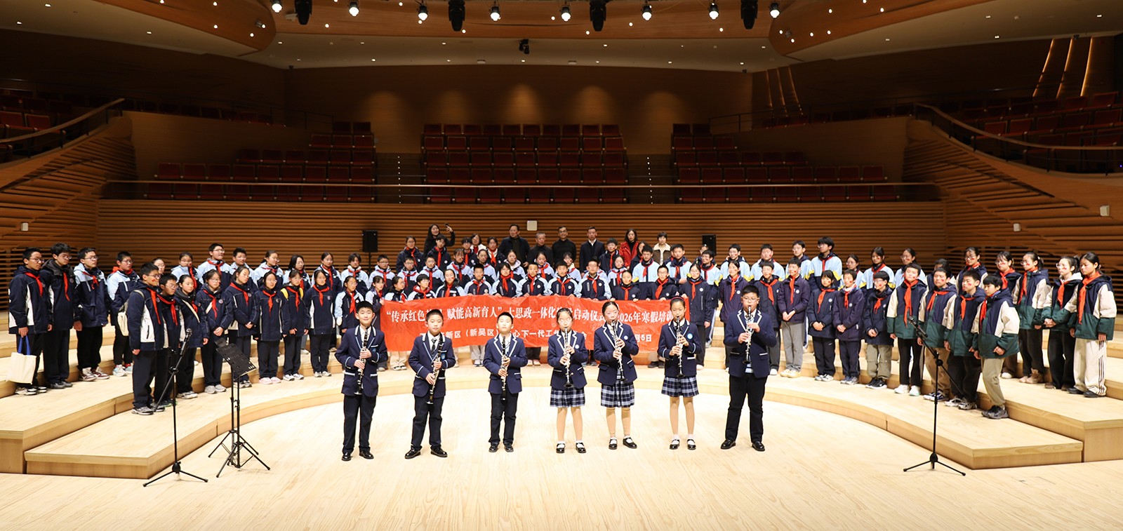 走进交响殿堂,开启美育实践之旅。启动仪式在无锡交响音乐厅举行。这座以“太湖明月”为设计灵感、融合建筑美学与绿色科技的文化新地标,为青少年提供了一场沉浸式的美育体验。活动中,坊前实验小学芳菲管乐团演奏了《四季的轮回》《这世界那么多人》等曲目,学生们手持宣传牌从廊桥走向会场,展现青春活力。最后,全体人员齐声高唱《我们是共产主义接班人》,激昂的歌声将现场氛围推向高潮,红色基因在音符中悄然传承。