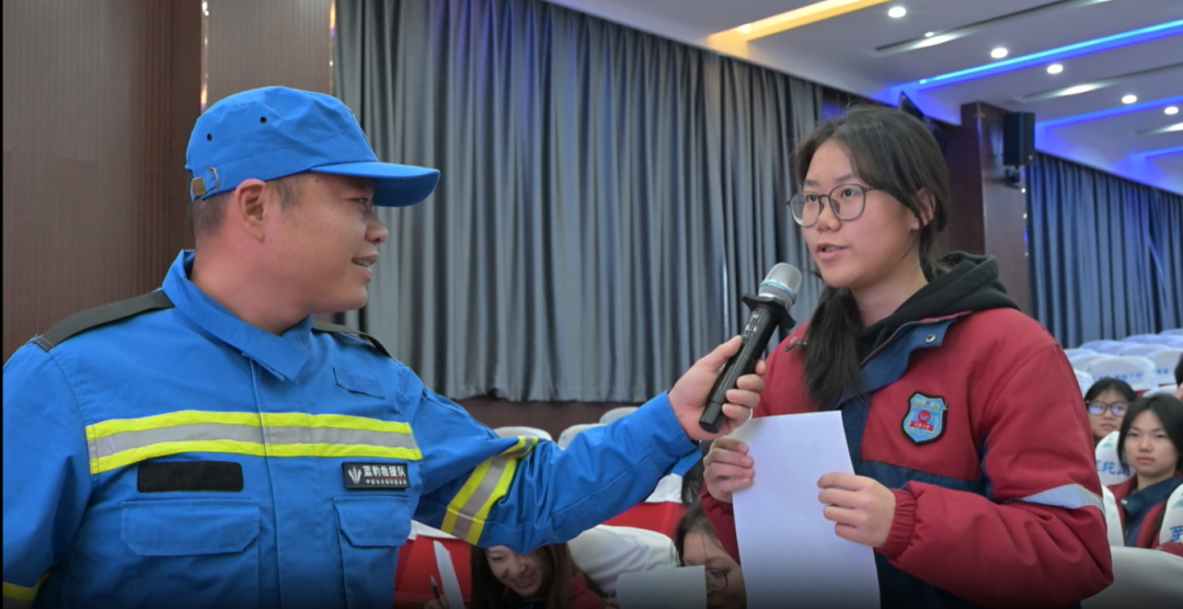 在避险逃生技能环节,讲师则针对火灾与地震这两类常见灾害,传授了关键的自我保护要点。从火场中如何防止吸入浓烟、选择正确路线快速疏散,到地震发生时如何科学地“伏地、遮挡、手抓牢”,以及在震后如何有序撤离至安全地带,每一个知识点都深入浅出,贴近实际,引得同学们频频点头。