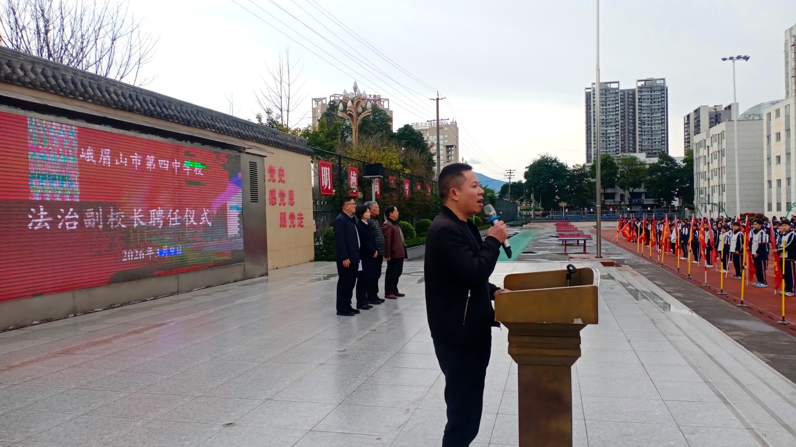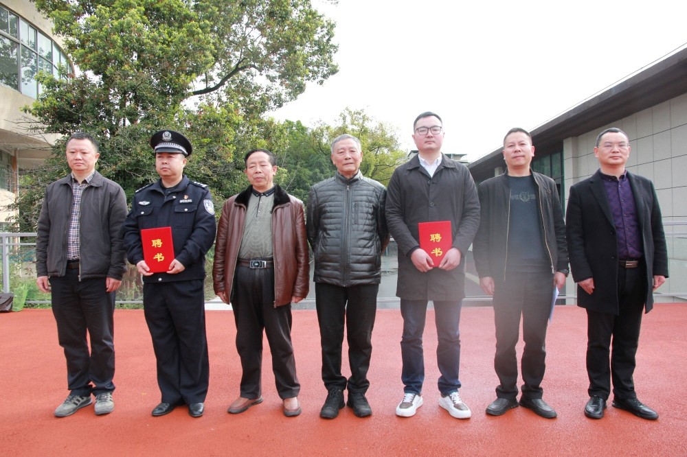 活动在庄严的唱国歌升国旗仪式中进行,学校校长胡贵全分别为峨眉山市人民检察院检察长汪恒、峨眉山市公安局名山派出所所长王涛两位同志颁发“法治副校长聘书”。
