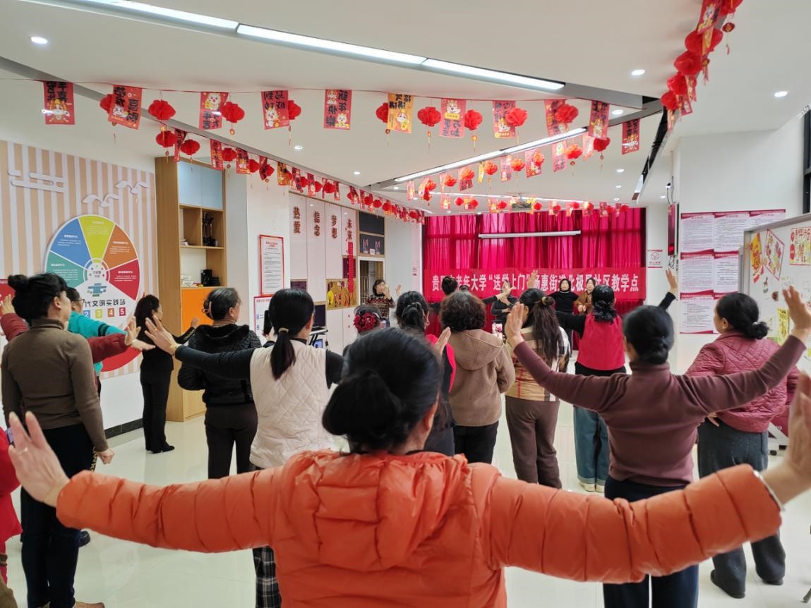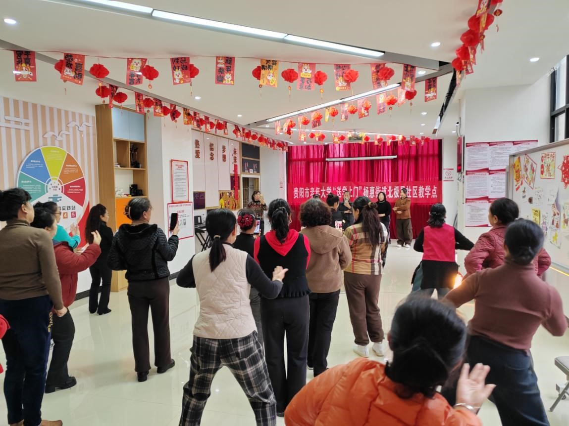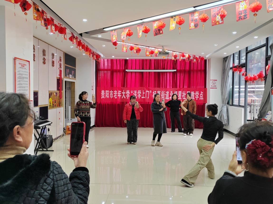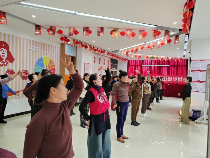 为丰富社区老年人精神文化生活,让老年人在“家门口”享受优质教育服务,云岩区杨惠街道关工委、北极星社区积极配合市老年大学开展“送学上门”舞蹈教学活动,将专业舞蹈课程直接送到区老年人身边。精准对接需求,课堂搬进社区。社区通过日常走访了解到,许多老年人对舞蹈学习有浓厚兴趣,但受限于距离和交通,难以参加老年大学的课程。为此,社区主动对接上级部门,邀请市老年大学专业教师下沉社区,将舞蹈课堂设在社区文化活动室,让老年学员下楼就能上课。3月9日下午,市老年大学舞蹈老师肖坤灵早早来到社区,针对老年人的身体特点和学习需求,精心编排了简单易学、节奏舒缓的舞蹈课程。教学中,老师耐心分解动作,逐一示范指导,学员们认真跟学,反复练习。伴随着悠扬的音乐,老人们舒展身姿,脸上洋溢着愉悦的笑容。课间休息时,学员们互相切磋舞技,分享生活趣事,现场气氛温馨融洽。此次“送学上门”不仅为老年人提供了专业的学习机会,也搭建了邻里互动交流的平台。参与活动的居民杨阿姨表示:“老师教得专业又耐心,下楼就能学到正规的舞蹈课,感觉生活更有滋味了。”