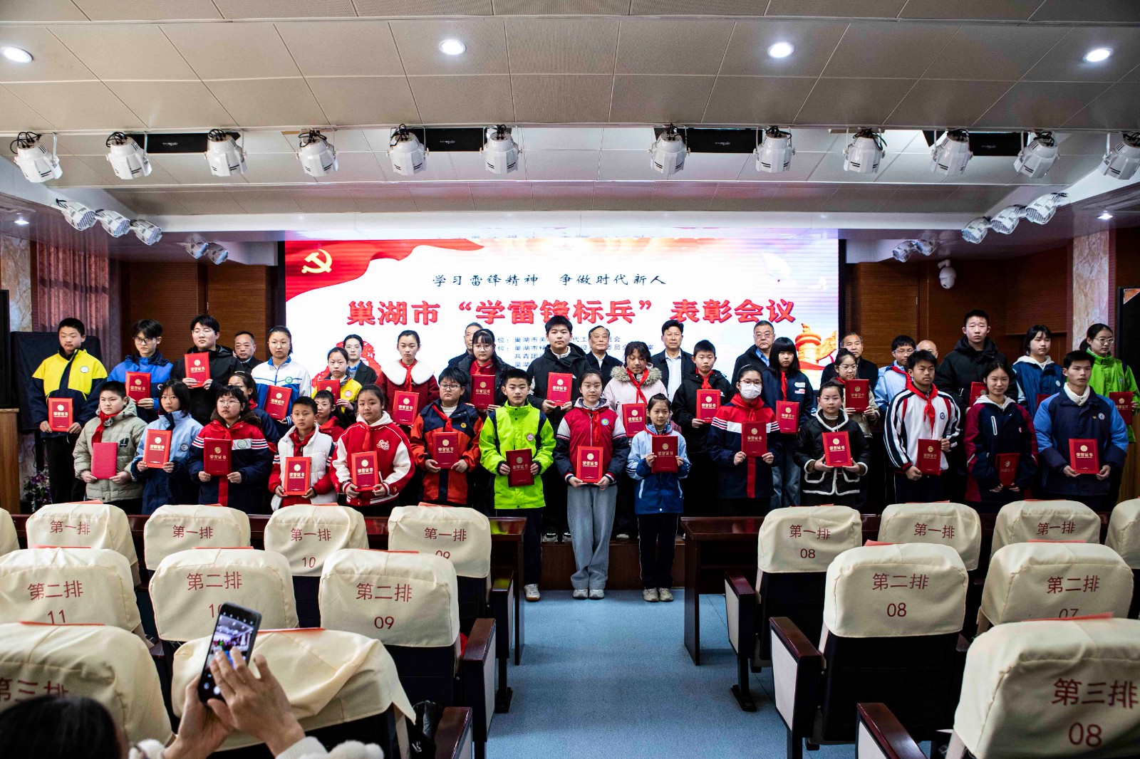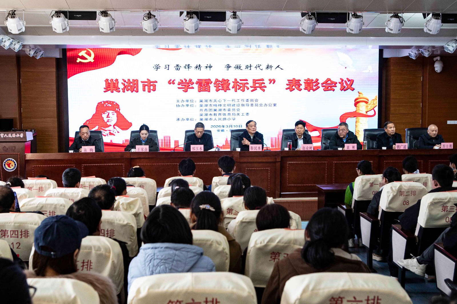 3月10日上午,由安徽省合肥市巢湖市关工委主办,市文明办、团市委、市教体局关工委协办,市人民路小学承办的巢湖市“学雷锋标兵”表彰会议在市人民路小学西校区报告厅召开。出席表彰会议的有市关工委主任靳民本等。各镇、街关工委主任,受表彰的“学雷锋标兵”和老师代表,共计70余人参加了会议。