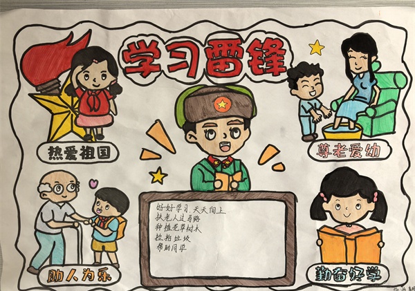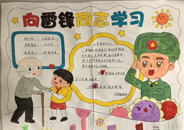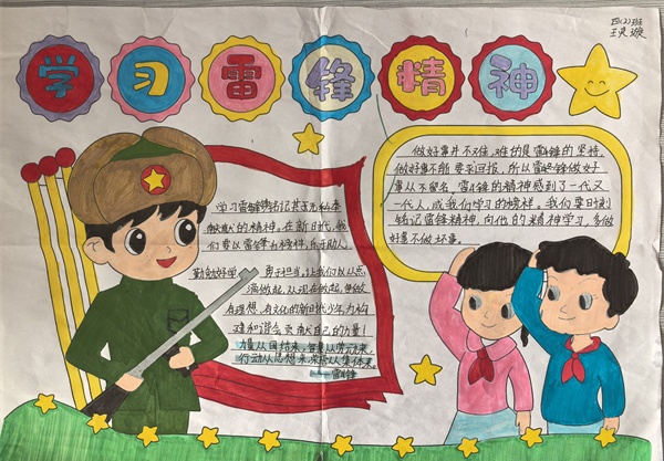 展示现场,一幅幅色彩鲜艳、内容丰富的手抄报整齐排列,吸引了众多师生驻足观看。《雷锋叔叔的故事》手抄报,用稚嫩的画笔绘制了雷锋帮助老人、雨中送大嫂回家等场景,旁边配上"我要向雷锋叔叔学习,帮助身边的人"的文字,字里行间充满了对雷锋的敬佩;五(1)班同学的《雷锋精神永流传》手抄报,不仅有雷锋的生平事迹,还结合学校的学雷锋活动,写下了"我们班每周帮助一位同学补习功课"的实践内容,体现了将雷锋精神融入日常的思考;六(1)班同学则采用"漫画+文字"的形式,生动展现了雷锋"钉子精神"的内涵,让抽象的精神变得直观易懂。