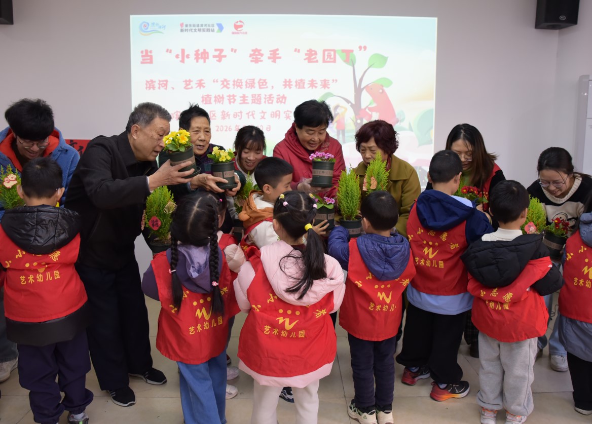 春回大地,绿意盎然,3月10日,江苏省太仓市娄东街道滨河社区关工委联合艺禾幼儿园,开展“‘萌娃’牵手‘老园丁’——交换绿色共植未来”主题活动。老小携手播种希望、传递温情。