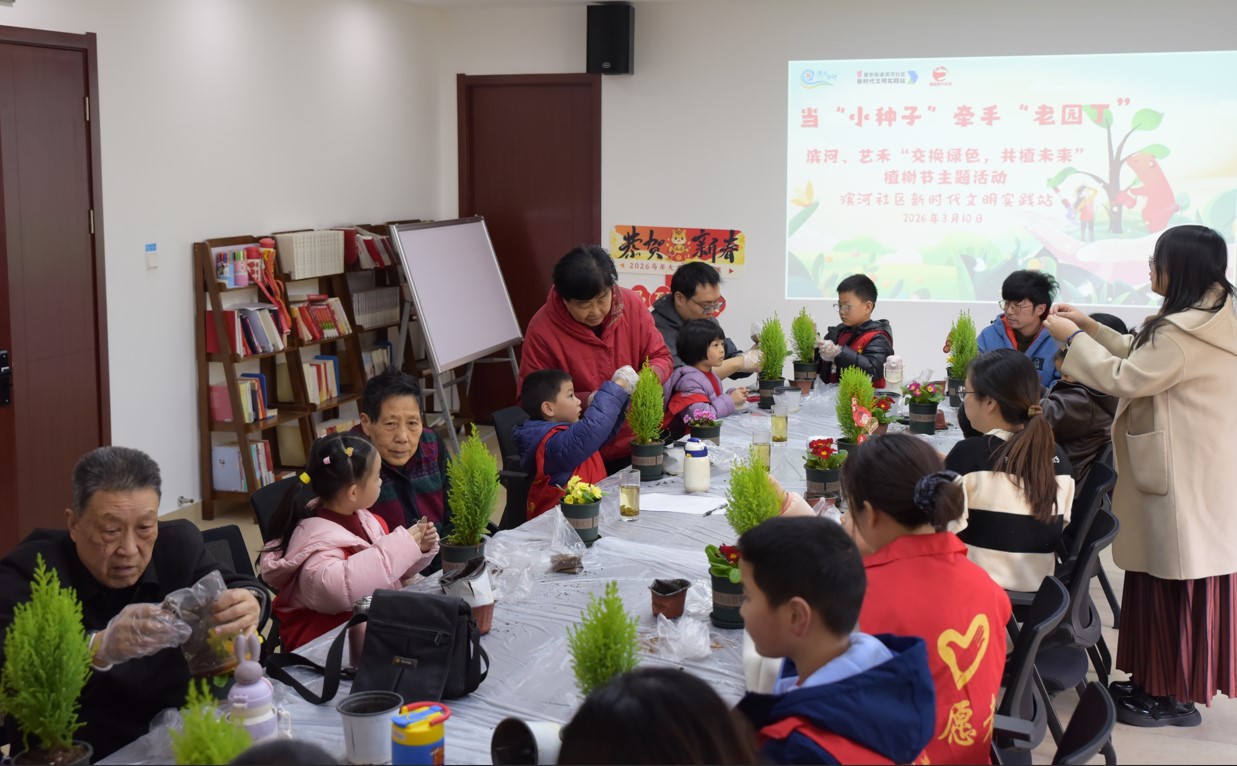 为传承绿色环保理念、搭建老少互动平台,当日下午,志愿者滨河社区二楼活动室先向小朋友介绍3月12日植树节的来历,以及绿化祖国保护环境的重要意义。绿植种植环节,社区关工委根据小朋友们实际情况,组织老少分组结对,“五老”们化身“老园丁”,耐心指导小朋友栽种小绿松、装饰花盆;同时,老干部们也亲手种植君子兰,打造可悬挂盆栽。