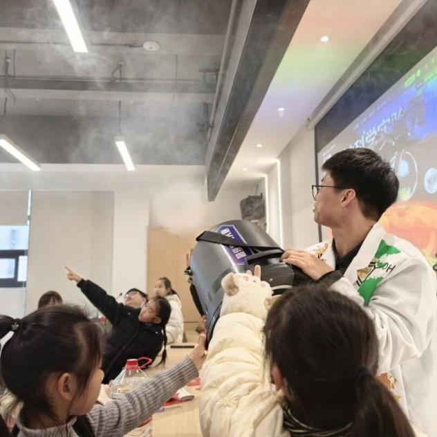 活动中,瓯海区科学教育指导中心陈孺老师带领孩子们开展了一系列趣味实验:车轮陀螺揭示重心与惯性原理,马德堡半球让孩子们亲身感受大气压强的强大力量,而“火焰掌”更是将现场气氛推向高潮——老师利用安全泡沫和水的隔热原理,让火焰在掌心跃动而毫无损伤,孩子们在惊呼中理解了热传导与安全常识。此外,悬浮魔法泡泡、空气大炮、人体导电灯等实验,也让抽象的科学原理变得触手可及。每个实验都遵循“讲解原理—动手操作—互动体验”的流程,孩子们在玩中学、学中乐,既收获了知识,也体验了科学创造带来的成就感。