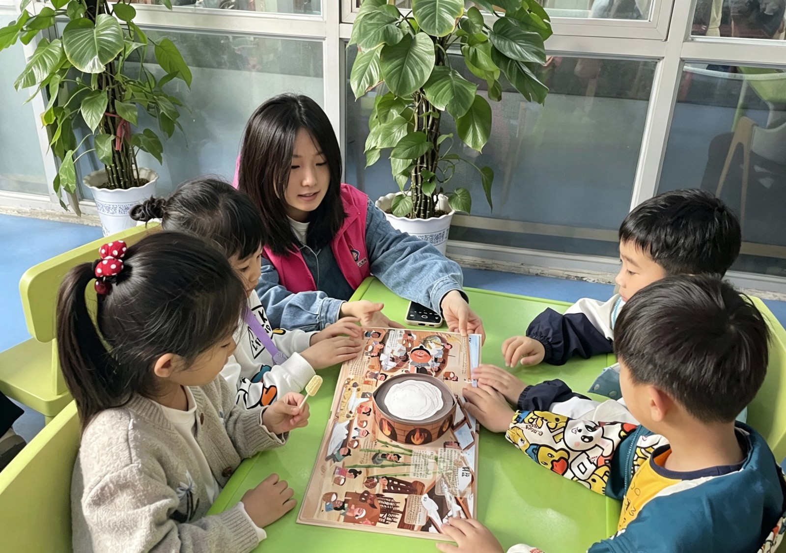 随后,大家移步图书馆阅览区。孩子们围坐在一起,翻开专为他们准备的《天工开物》彩绘版。巾帼志愿者老师以活泼生动的讲述,将“乃粒”“粹精”篇章中稻谷成饭、谷物变粉的智慧娓娓道来。孩子们听得入神,踊跃发问,亲子并肩阅读、互动讨论,不仅加深了对典籍内容的理解,也在温馨的氛围中传递了书香与亲情。
