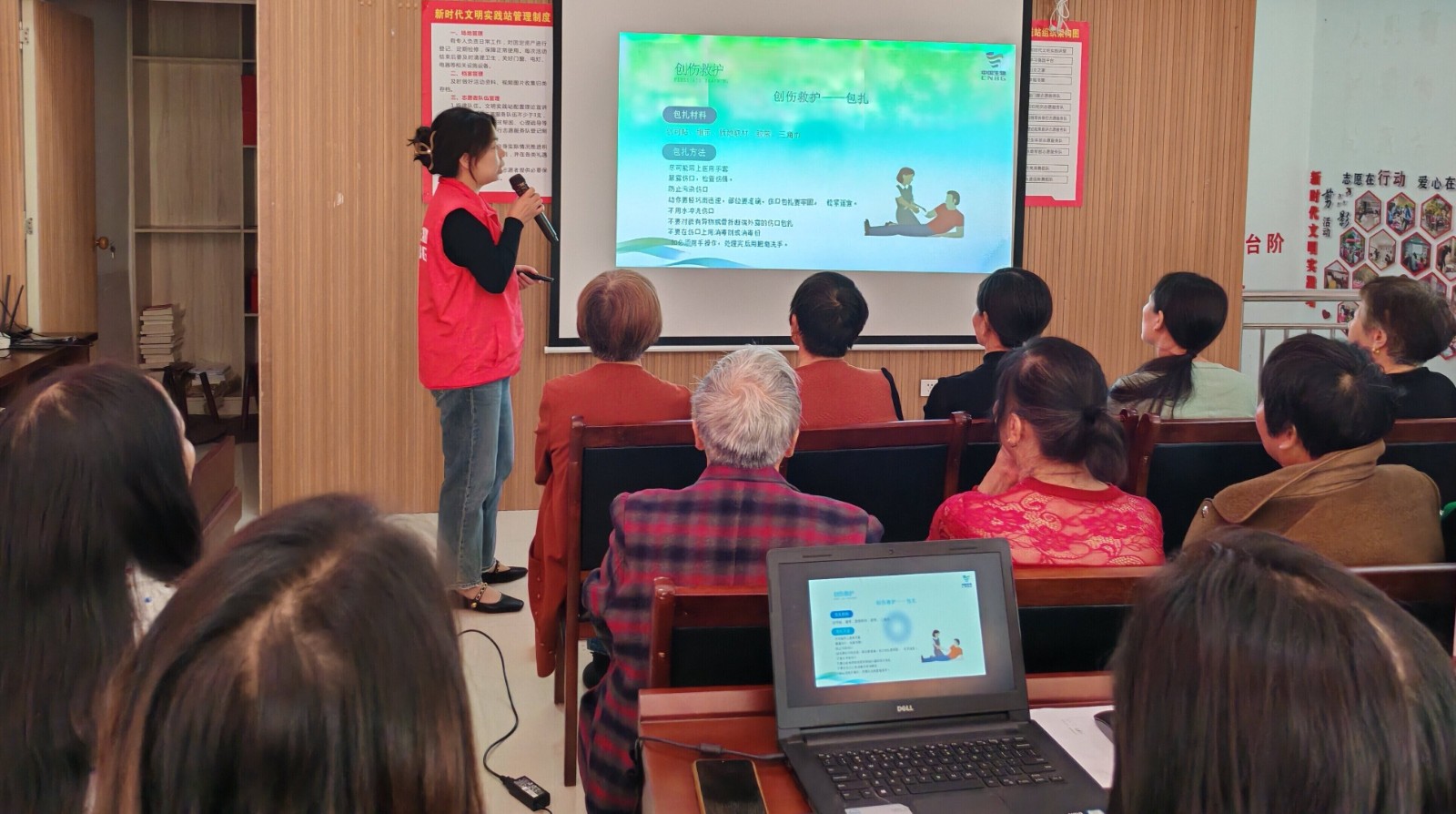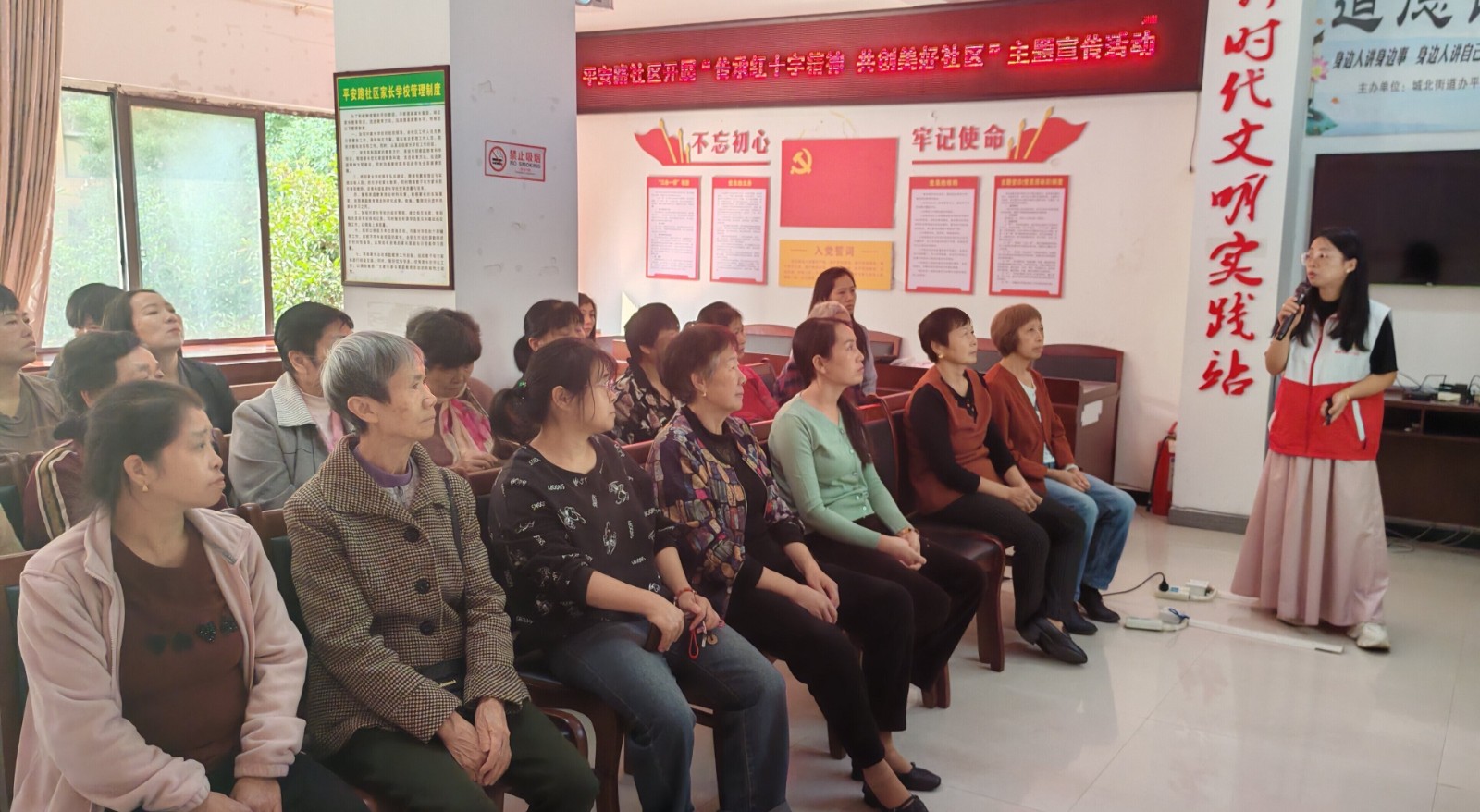 活动伊始,金老师详细介绍了红十字的起源,让大家深入了解这一组织的历史渊源和重要意义。陏后,讲解了红十字精神,对红十字会在人道救援、医疗救助、无偿献血等方面向居民们进行了普及,让居民们了解红十字精神及其核心价值,以及红十字会对于社会的重要贡献。最后,志愿者通过生动的讲解创伤救护相关知识,让居民们掌握了包扎方法、伤口异物处理等实际操作技能。