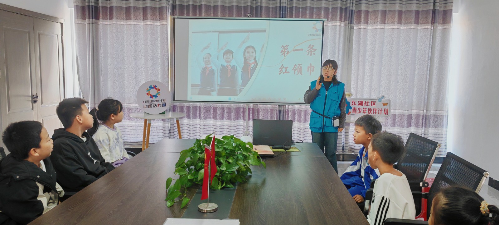 志愿者老师以《第一条红领巾》为主题,为青少年讲述了安源儿童团的故事,了解了第一条红领巾是如何在历史的风云中诞生,又是如何激励无数少年为了理想而拼搏奋斗。随后,志愿者老师还带领青少年开展“ 乐在球中,益加精彩”趣味篮球运动。