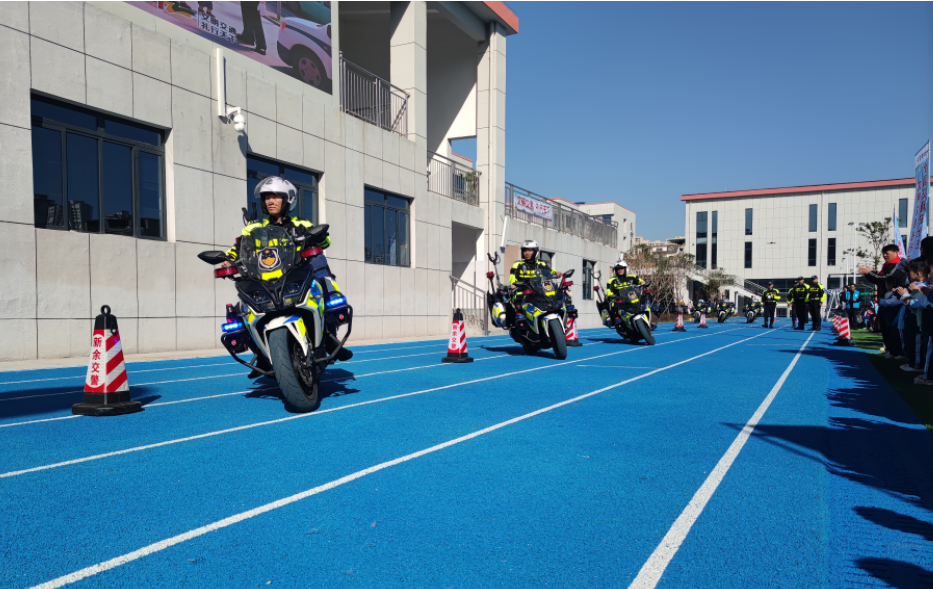 “哇!太酷了!”伴随着同学们的一阵惊呼,英姿飒爽的铁骑队员驾驶着警用摩托车闪亮登场。他们以精湛的技艺,现场演示了绕桩、S形路线行驶等高难度驾驶动作,展现了交警队伍过硬的专业素养,赢得了师生们的热烈掌声。