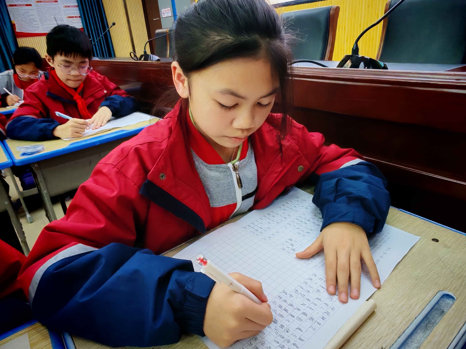 比赛现场,选手们坐姿端正、神情专注,将积累与感悟融入字里行间,充分展现了学生扎实的写作功底与丰富的内心世界。
