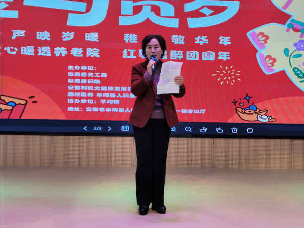 县关工委常务副主任周莉在演出致辞中向老前辈们致以诚挚的新春问候与美好的节日祝愿,感谢对他们为阜南发展作出的重要贡献。希望社会各界持续坚守初心、勇担使命,一如既往地关注老年群体的生活需求与精神期盼,让老人们安享幸福晚年。同时,寄语孩子们要以老前辈们为榜样,铭记奋斗历程、传承优良作风,刻苦钻研、奋发向上,努力成长为有理想、有道德、有文化的新时代好少年,用实际行动回报社会、建设家乡。
