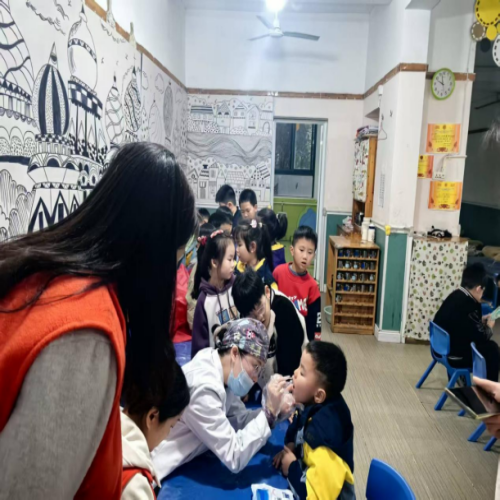 活动现场,口腔医生为大班的小朋友们介绍了牙齿的基本知识、常见的牙齿疾病、怎样保护牙齿、“怎样才能远离蛀牙”等内容,告诉大家要养成良好刷牙习惯,少吃糖果和甜食,以及每半年进行口腔检查是保护牙齿的关键,帮助他们树立了“爱护牙齿 从小做起”的健康观念。在实操教学环节,医生手持儿童专用牙刷,现场示范圆弧刷牙法,手把手指导孩子们掌握刷牙的角度、力度与时长。孩子们纷纷举起小手模仿,认真练习每一个动作,现场氛围轻松又热烈。同时,医生还叮嘱孩子们少吃甜食、少喝碳酸饮料,养成早晚刷牙、饭后漱口的好习惯,把护牙理念根植于心。随后,医生现场为小朋友们细致查看乳牙生长、龋齿、牙龈健康等情况,并针对不同情况提供相应的口腔保健建议。